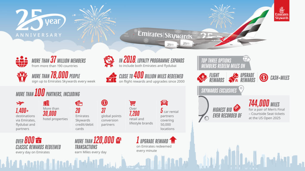 “25 years! We are thrilled to celebrate such a monumental milestone. Emirates Skywards is a true success story – one that was born in Dubai and has now become one of the most recognised and loved loyalty programmes in the world with millions of members based in the UK, US, UAE, India, Australia and beyond.
